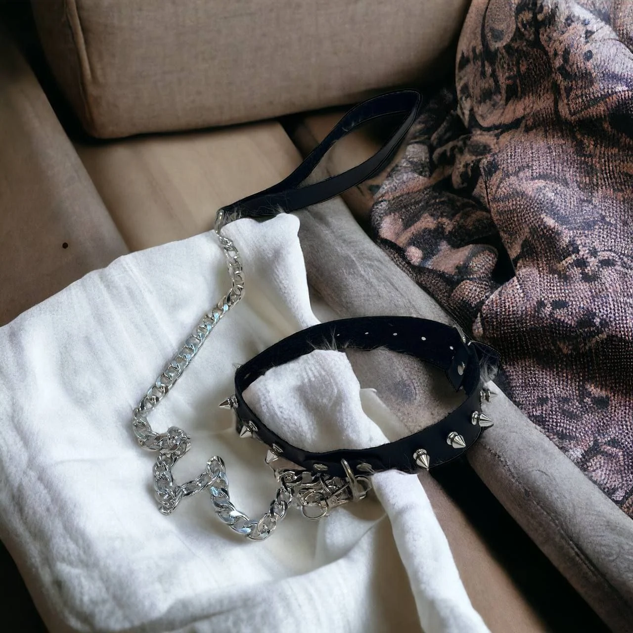 ✨ قلاده میخی حرفهای BDSM چرم طبیعی + زنجیر فلزی آبکاریشده 🔥